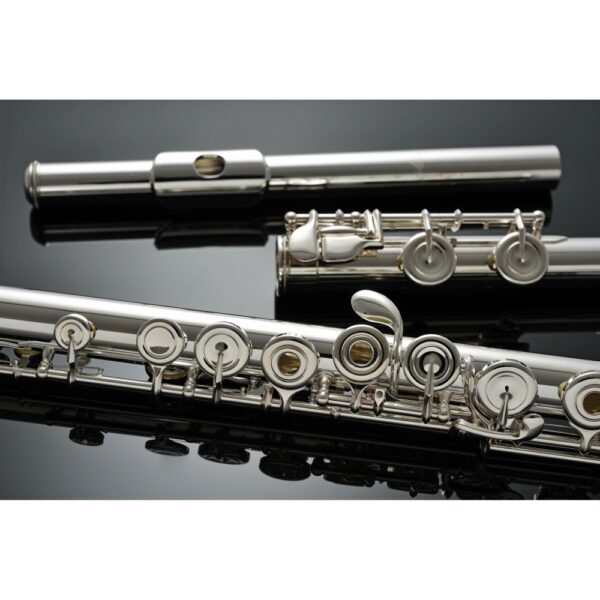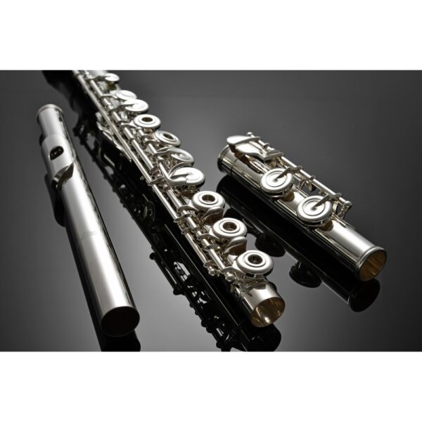 Naast het kopstuk is ook de lipplaat en mondstukschouw uitgevoerd in Sterlingzilver (925), wat bijdraagt aan de rijke klankkleur en flexibiliteit van de toon. Het corpus en mechaniek zijn vervaardigd uit verzilverd nieuwzilver, wat niet alleen duurzaamheid garandeert maar ook een heldere, sprankelende toon ondersteunt.