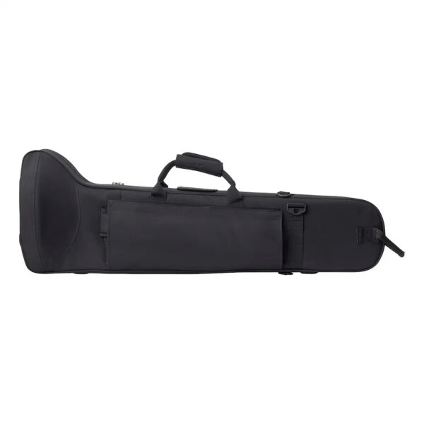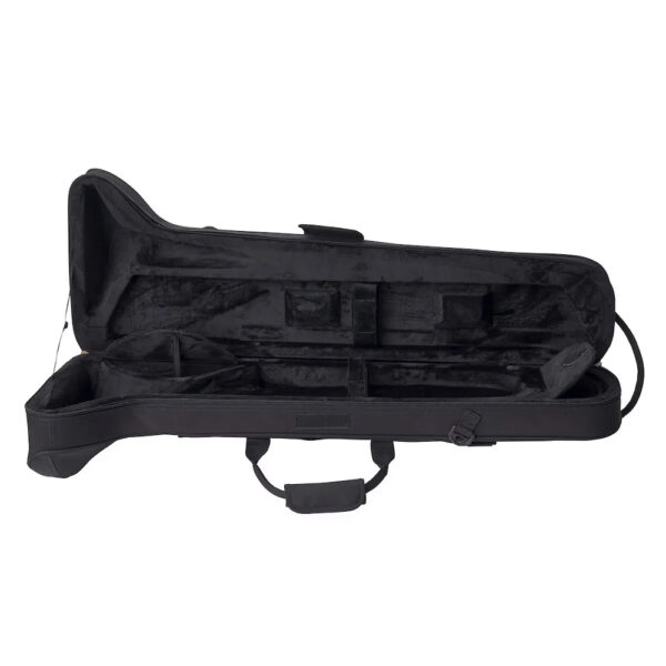 Aan de binnenzijde vind je een mondstukzakje en twee extra opbergvakken met elastische sluiting. Deze zorgen ervoor dat kleine onderdelen veilig opgeborgen blijven. De coulisse van de trombone wordt veilig opgeborgen in het deksel van de koffer, met behulp van zachte klittenbandriemen.